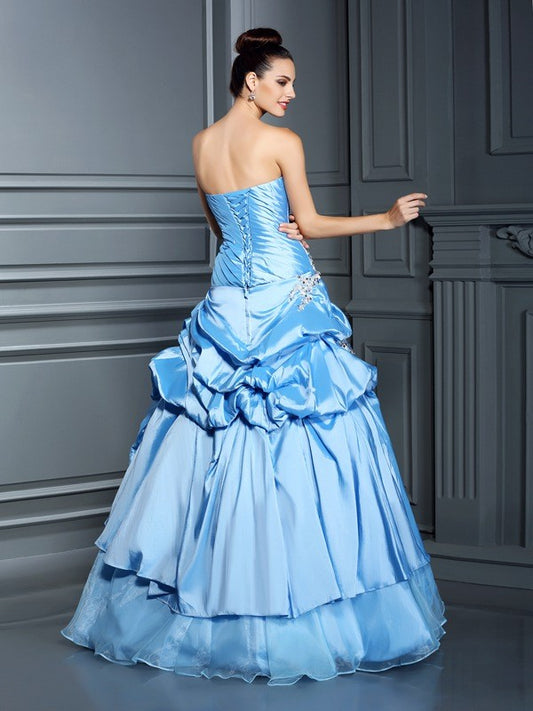 Vestidos de quinceañera largos de tafetán sin tirantes con cuentas y sin mangas
