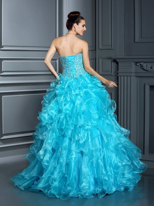Vestidos de quinceañera largos de organza sin mangas con escote en forma de corazón y cuentas