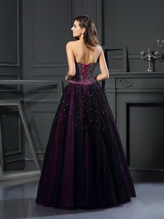 Vestidos de quinceañera largos de tafetán con cuentas, sin tirantes y sin mangas
