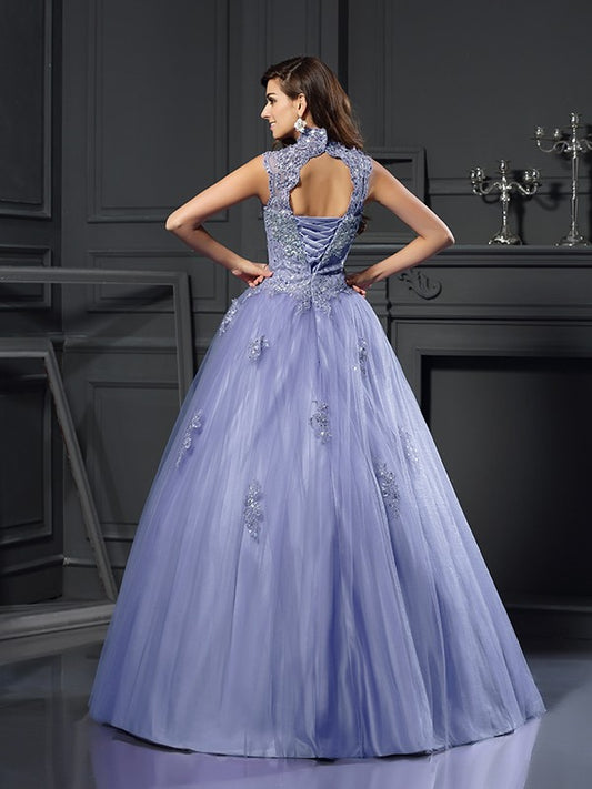 Vestidos de quinceañera largos de red, sin mangas, con cuello alto y cuentas
