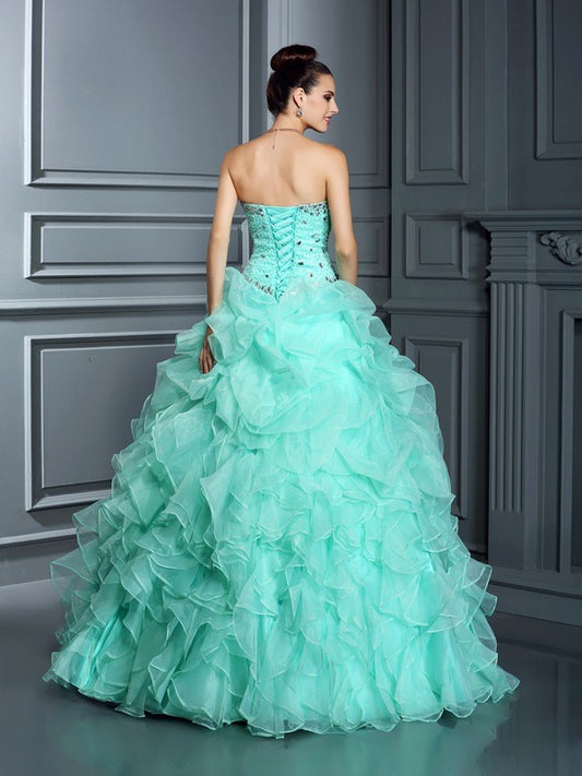 Vestidos de quinceañera largos de organza con cuentas y escote corazón sin mangas