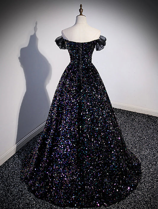 Vestido de fiesta negro vintage de quinceañera, formal, de noche, largo hasta el suelo, manga larga, hombros descubiertos, satén con lentejuelas