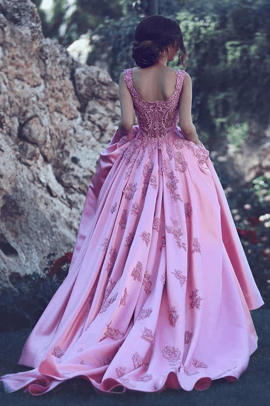 Vestido de quinceañera largo de tul con apliques de encaje rosa y escote corazón vintage