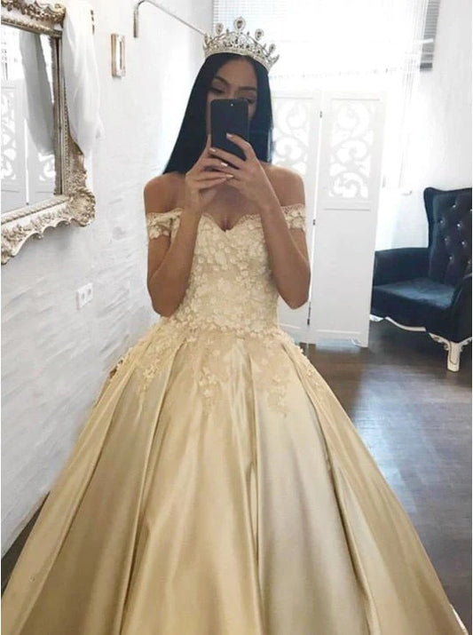 Vestidos de quinceañera con apliques de encaje y satén color champán y dorado