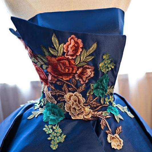 Vestido de fiesta azul oscuro de satén sin tirantes con encaje y apliques, vestido largo de quinceañera para fiesta de graduación