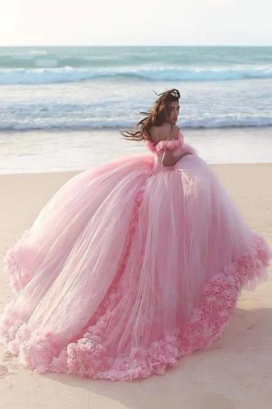 Vestido de quinceañera con hombros descubiertos, tul con flores hechas a mano