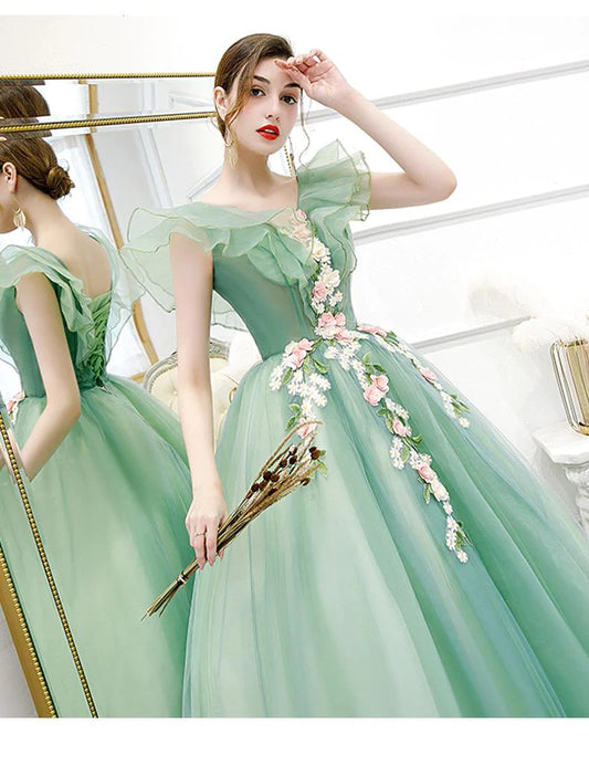 Vestido de fiesta con hombros descubiertos y flores, largo hasta el suelo, para quinceañeras con apliques
