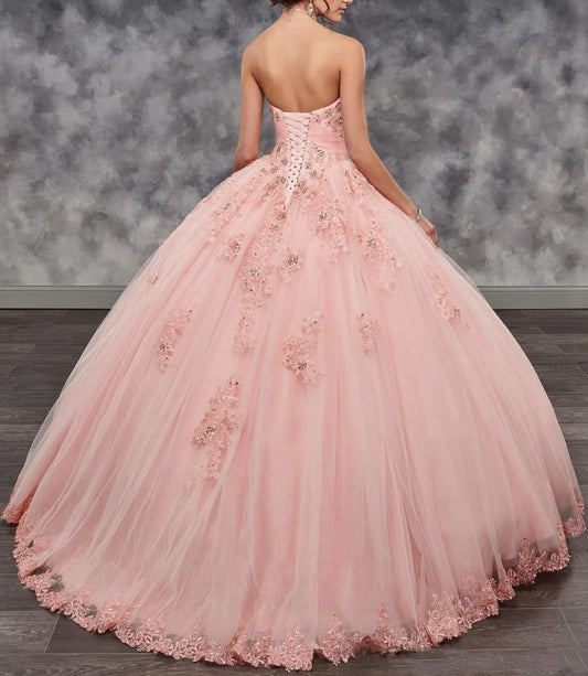Vestido de quinceañera rosa sin tirantes, con apliques de encaje y cuentas