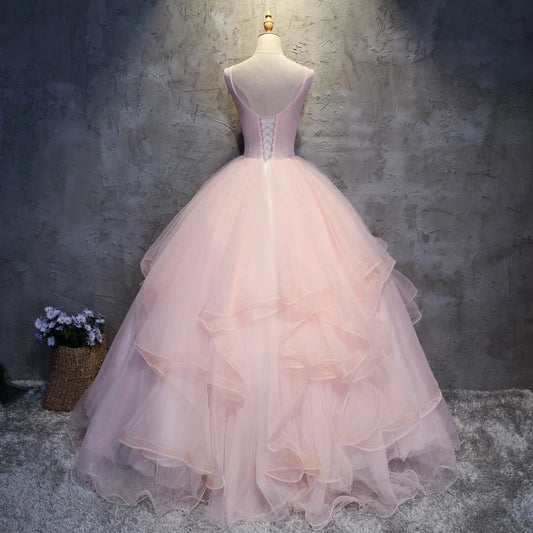 Vestido de fiesta de tul sin mangas con escote en V y apliques, largo hasta el suelo, vestido de quinceañera con vuelo