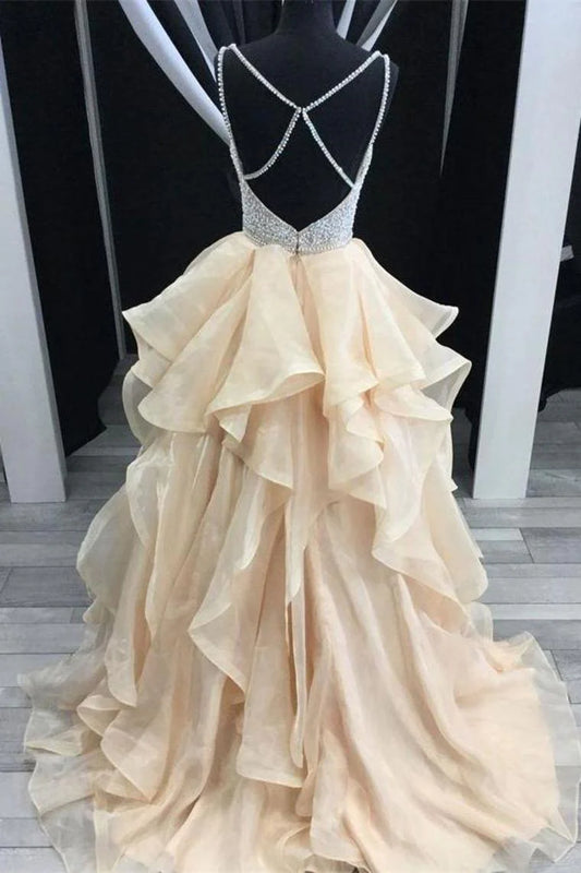 Vestido de fiesta de quinceañera con tirantes finos y cuentas color champán, estilo princesa.