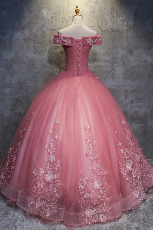 Vestido de quinceañera de tul rosa con hombros descubiertos y flores