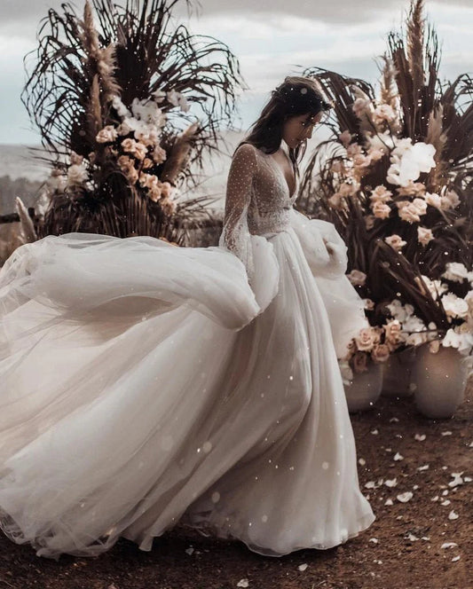 Vestidos de novia largos de tul con escote en V, ilusión de cuentas y espalda descubierta