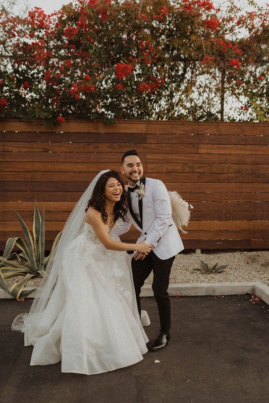Encantadores vestidos de novia color marfil con escote en V, corte sirena, sin tirantes y apliques de encaje.