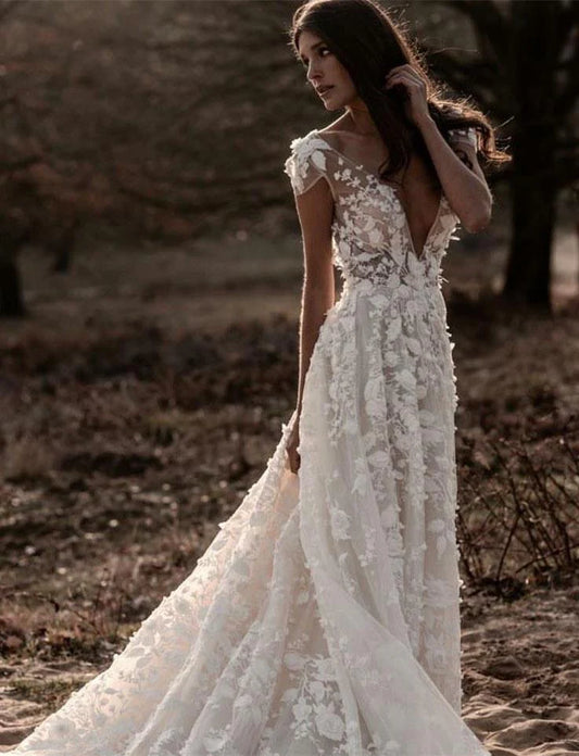 Vestidos de novia formales de playa, corte A, escote en V, manga larga, cola larga, encaje, con flores, color liso