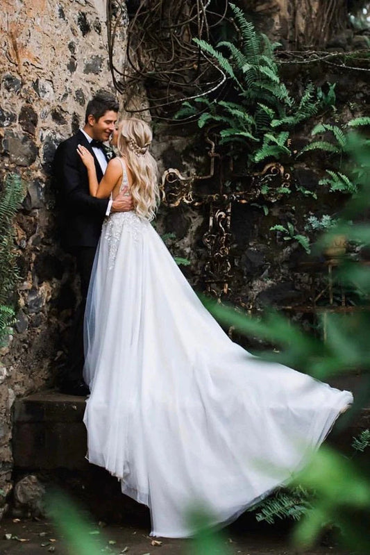 Vestidos de novia de playa con tirantes finos de tul y apliques, corte en A, espalda abierta