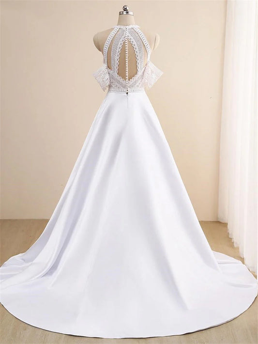 Vestidos de novia campestres de cuello alto con apliques de encaje sexy