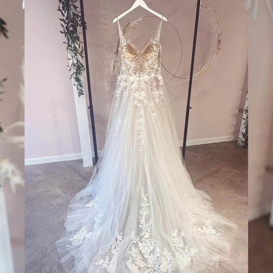 Vestidos de novia de corte A en tul con apliques y cola larga