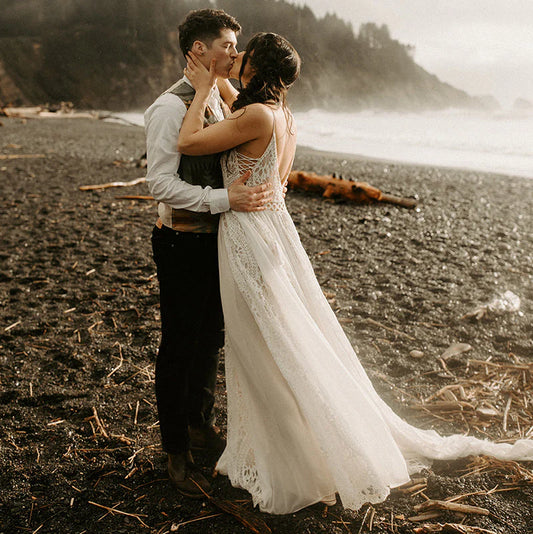 Vestidos de novia de playa con escote en V y espalda descubierta de gasa