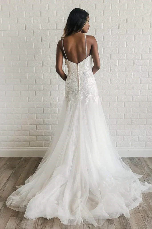 Vestidos de novia de sirena con tirantes finos de tul y apliques de encaje