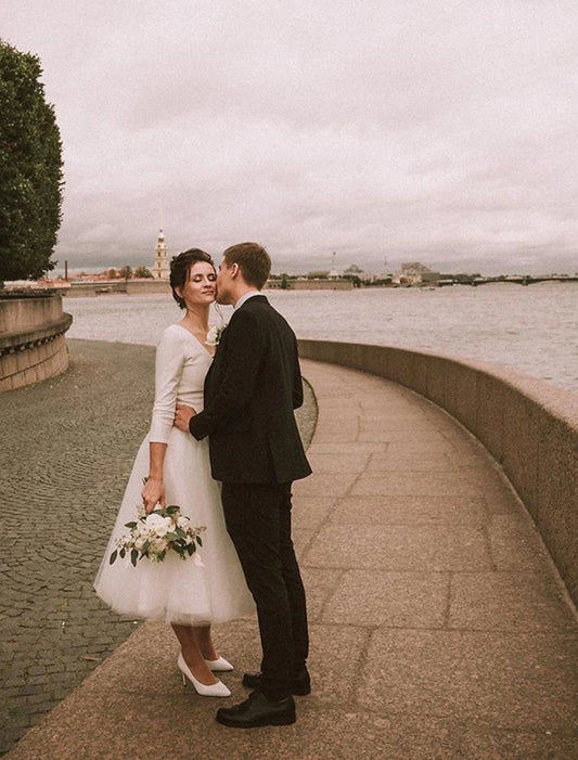 Vestidos de novia vintage de los años 40/50, blancos, de otoño, corte A, escote en V, manga larga, largo hasta la rodilla, de satén, color liso.
