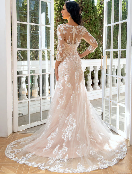 Vestidos de novia bohemios de playa con escote en V, corte sirena/trompeta, manga larga, cola de corte, encaje y apliques, color liso