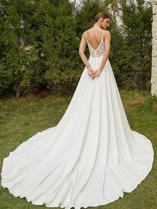 Vestidos de novia de corte A/princesa con encaje de crepé elástico, escote en V, sin mangas y cola catedral
