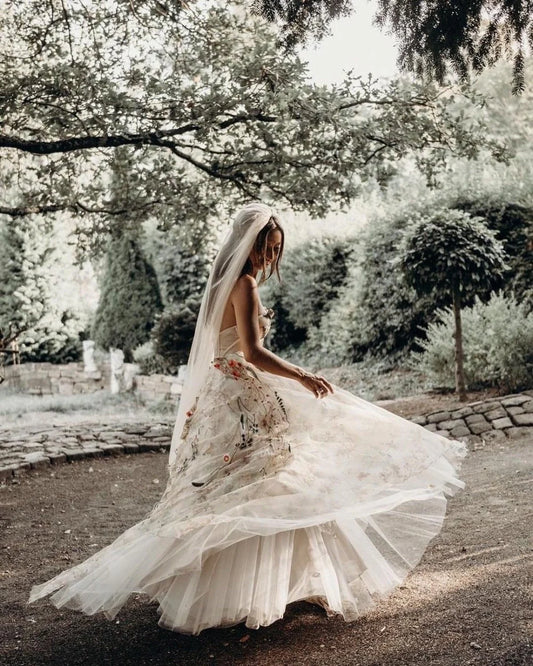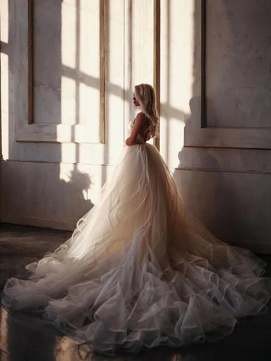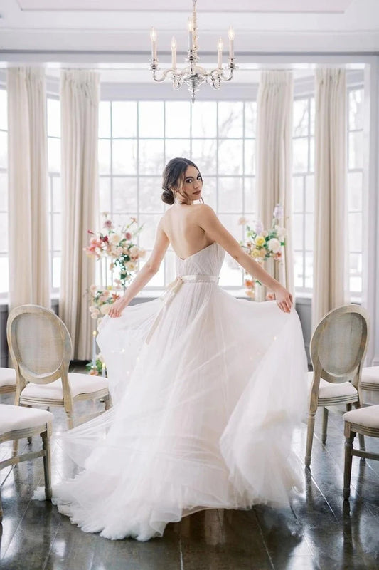 Vestidos de novia de tul de corte A sin tirantes y espalda descubierta con