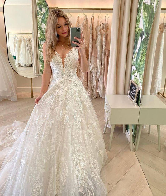 Vestidos de novia de cola larga, sin mangas, con encaje y tul, escote en V y corte A