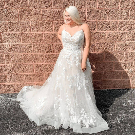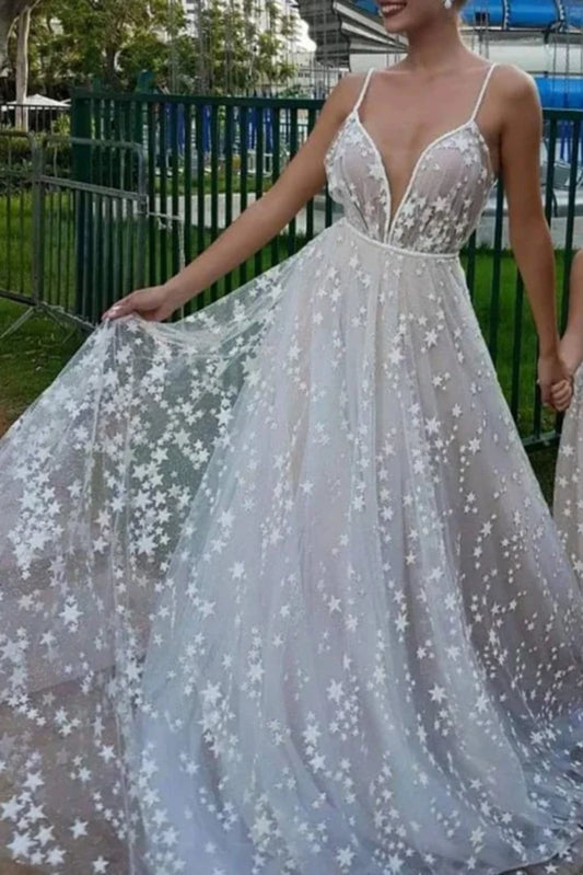 Vestido de novia con escote en V, tirantes finos, espalda descubierta y apliques