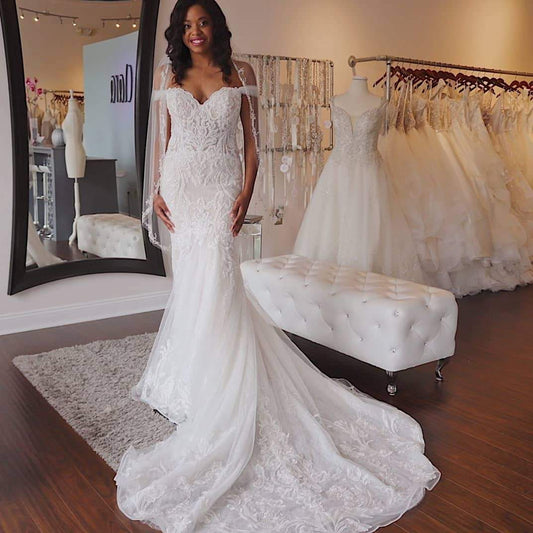 Vestidos de novia largos de encaje estilo sirena con hombros descubiertos