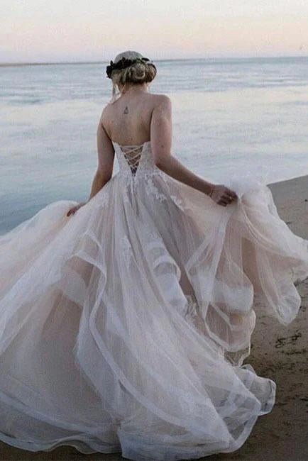 Vestido de novia de tul sin mangas, corte A, sin tirantes y con apliques