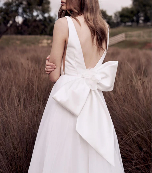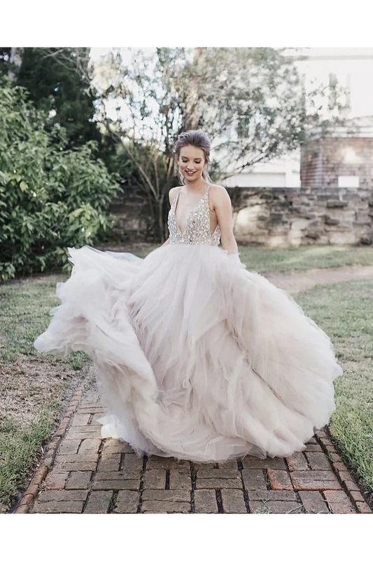 Vestido de novia rústico de corte A, sin mangas, con escote en V profundo y corpiño de cuentas de tul