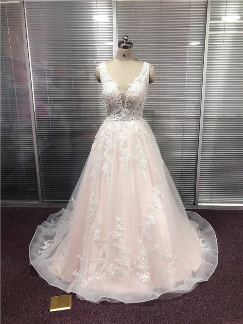 Vestidos de novia con escote en V, corte A, tul, apliques y cuentas