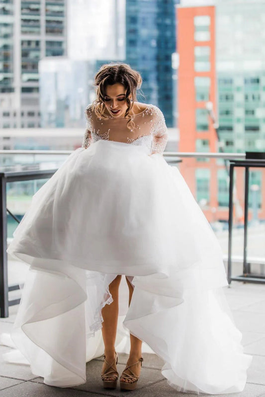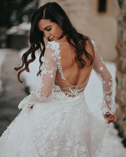Vestido de novia de tul de manga larga con escote redondo y escote en V, talla grande