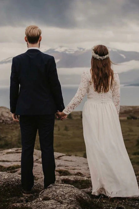 Vestidos de novia de playa con apliques de encaje y manga larga transparentes en forma de A