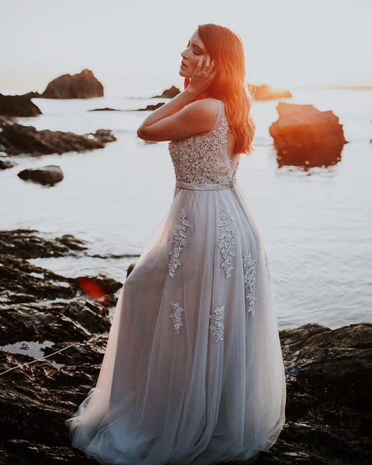 Vestido de fiesta largo sin mangas hasta el suelo con escote en V, de tul blanco con apliques de encaje