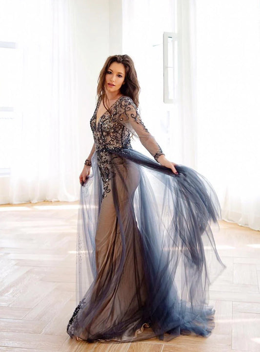 Vestidos de fiesta de tul gris con escote en V y mangas largas con cuentas