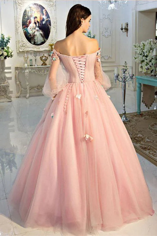 Vestido de fiesta de manga larga en color rosa perla con hombros descubiertos de tul y flores largas de hada