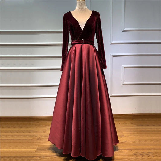 Vestido de noche de satén burdeos con escote en V profundo y abertura alta, corte A y manga larga