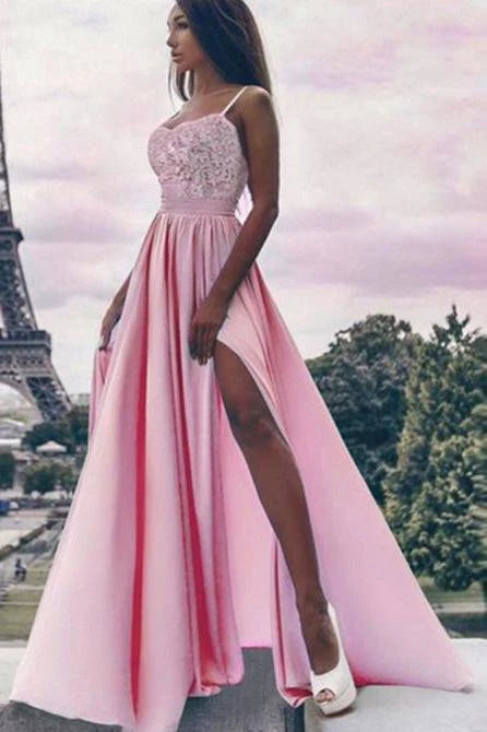 Vestido de fiesta de satén elástico con tirantes finos, corte A y abertura lateral con apliques