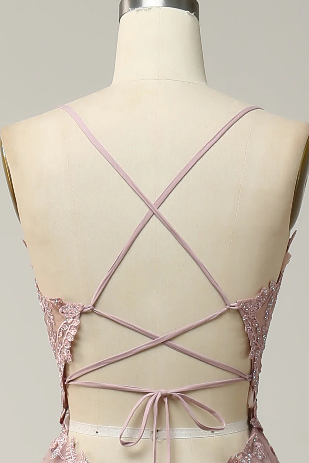 Vestido de fiesta largo color rubor con tirantes finos y apliques en forma de A