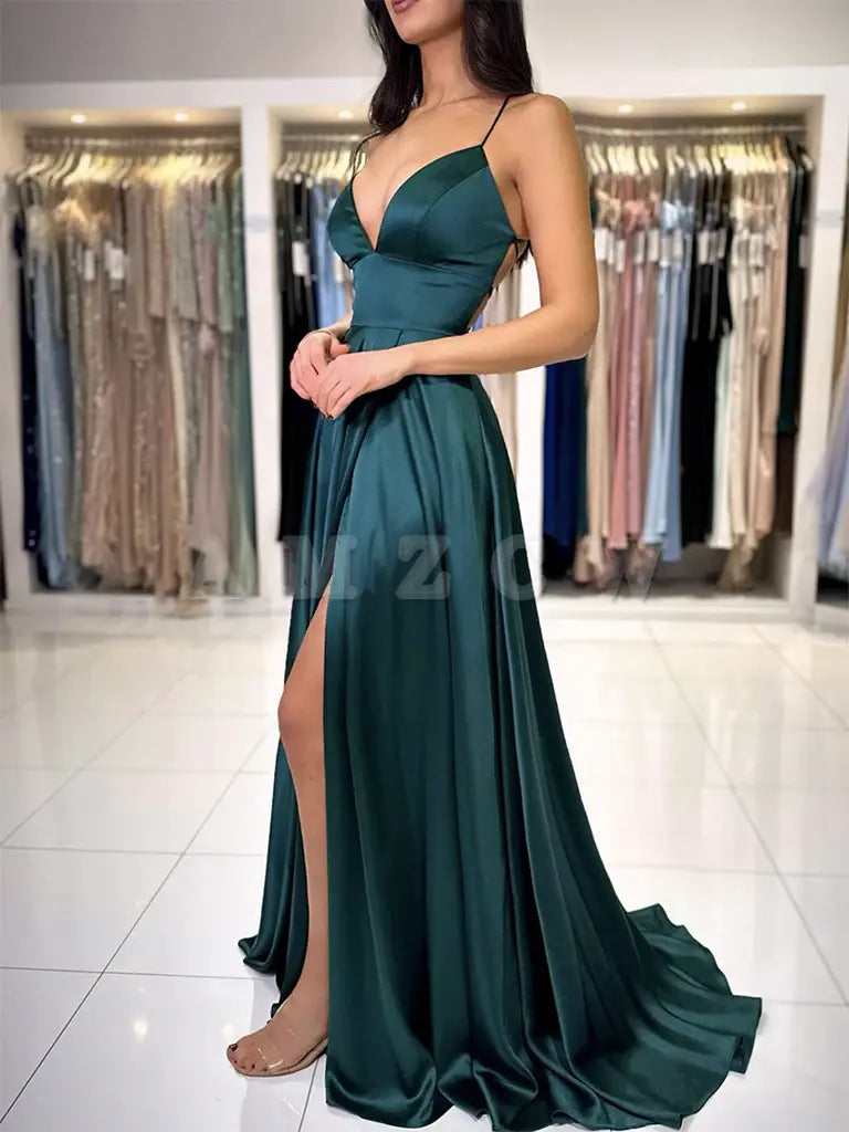 Vestido de fiesta largo de satén verde oscuro con escote en V y corte A de Amzcw, vestido de noche verde oscuro, tiendas de vestidos de fiesta