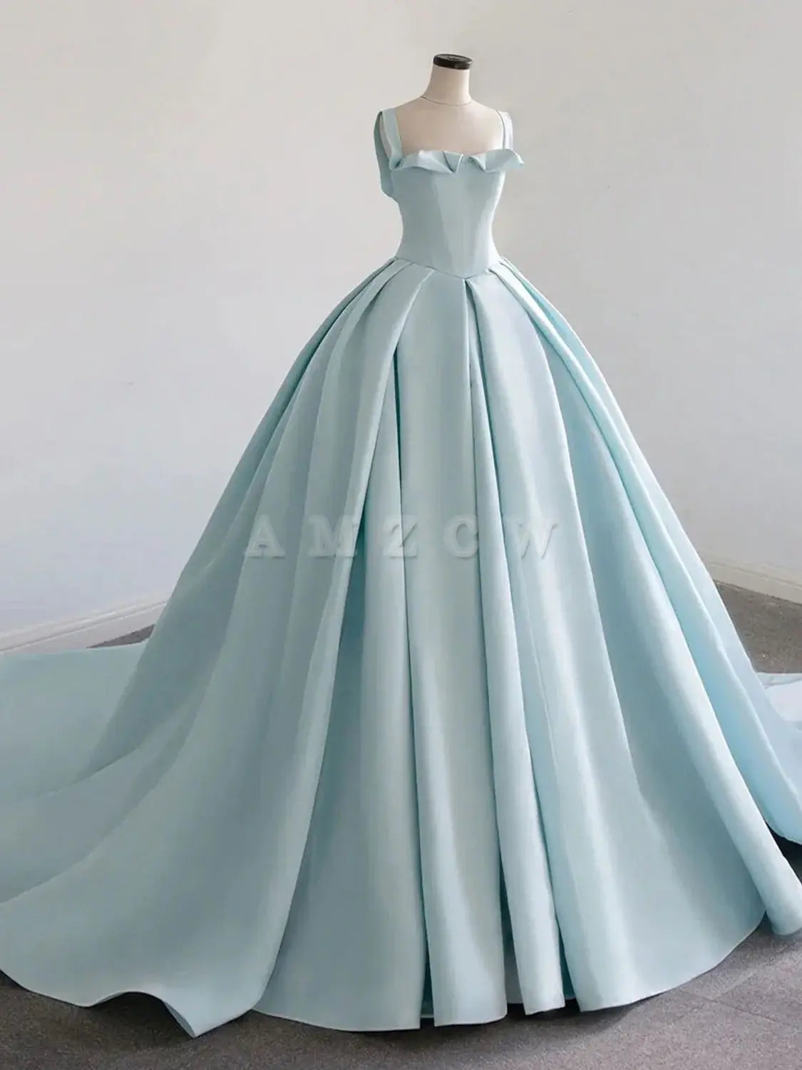 Vestido de fiesta largo de satén azul con cola larga Amzcw Vestido de noche de satén azul Vestido de fiesta en tienda