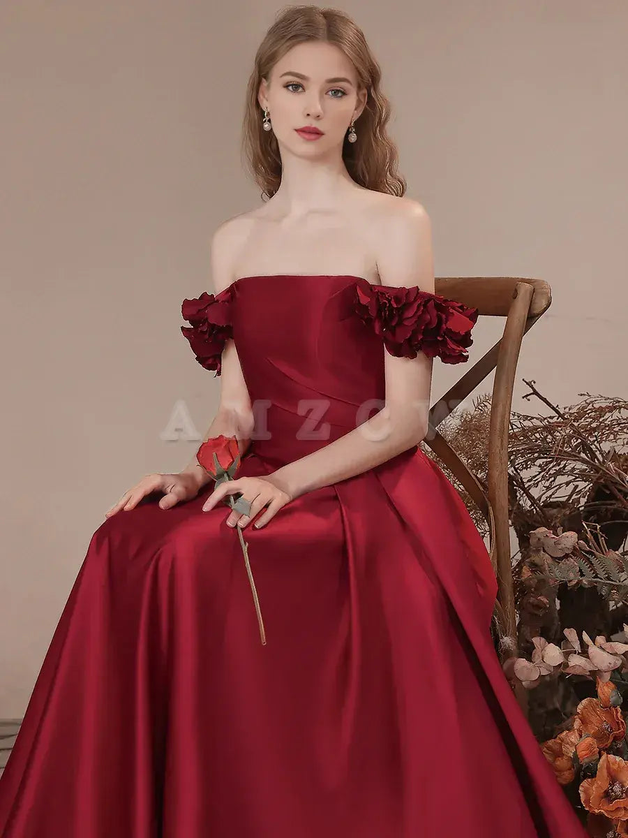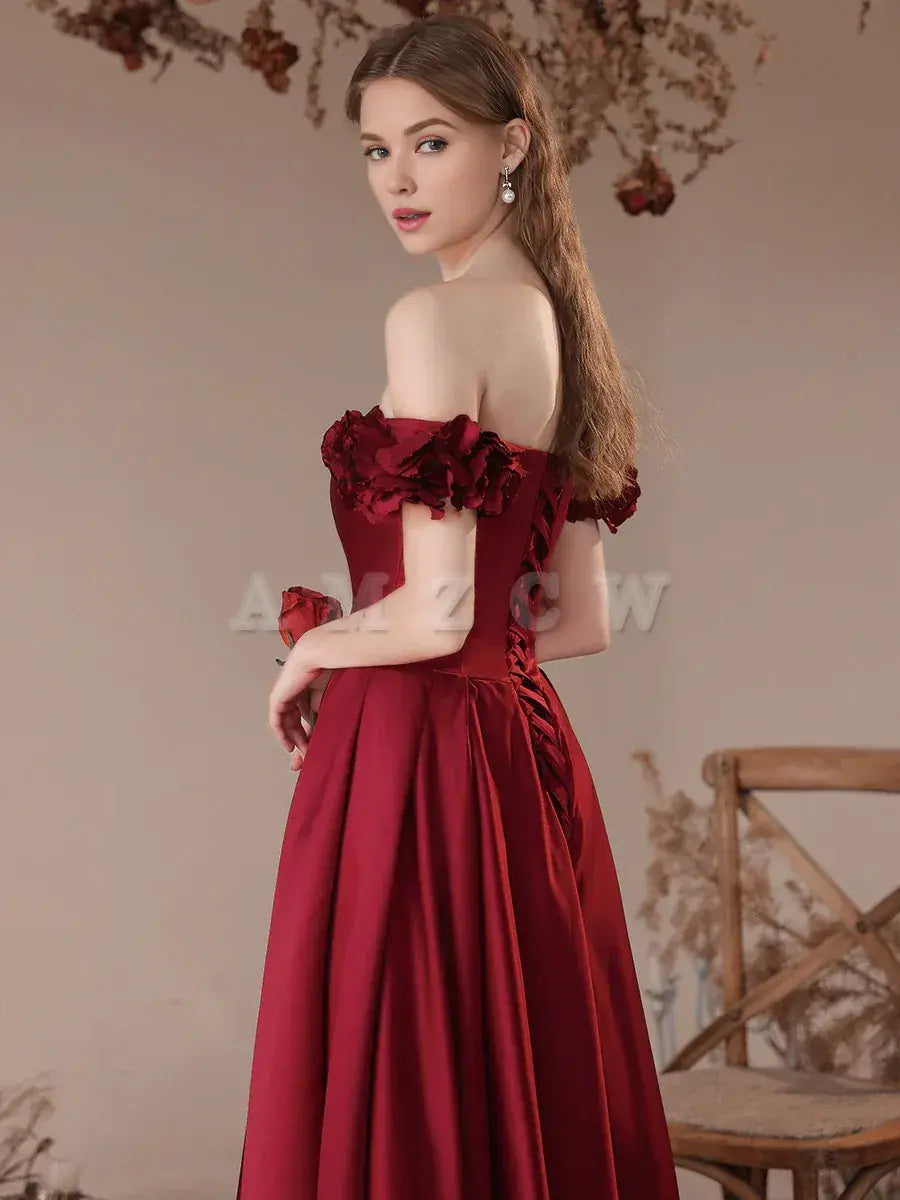 Vestido de fiesta largo de satén con hombros descubiertos y corte en A color burdeos de Amzcw. Vestido de noche formal color burdeos. Vestido de fiesta en tienda.