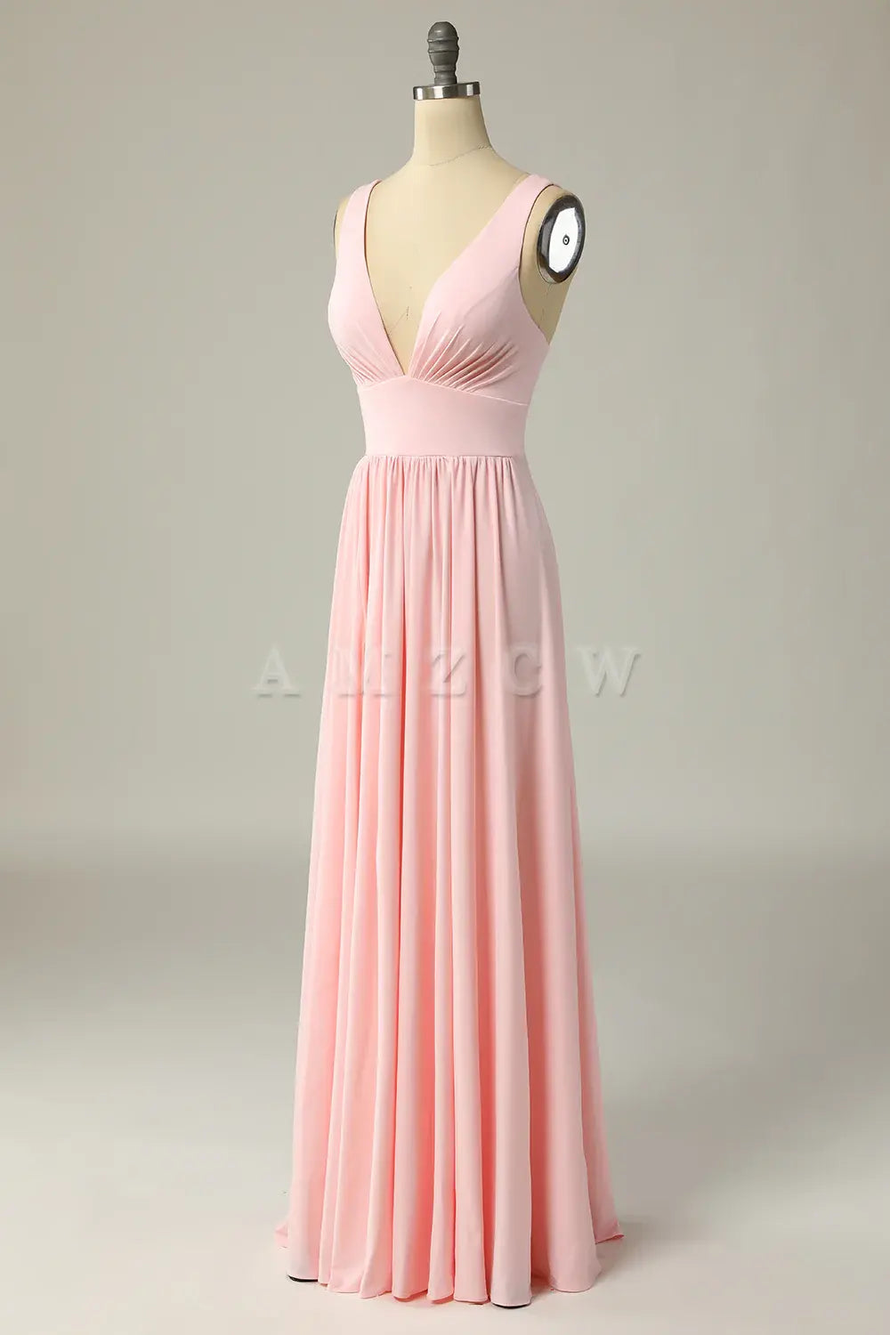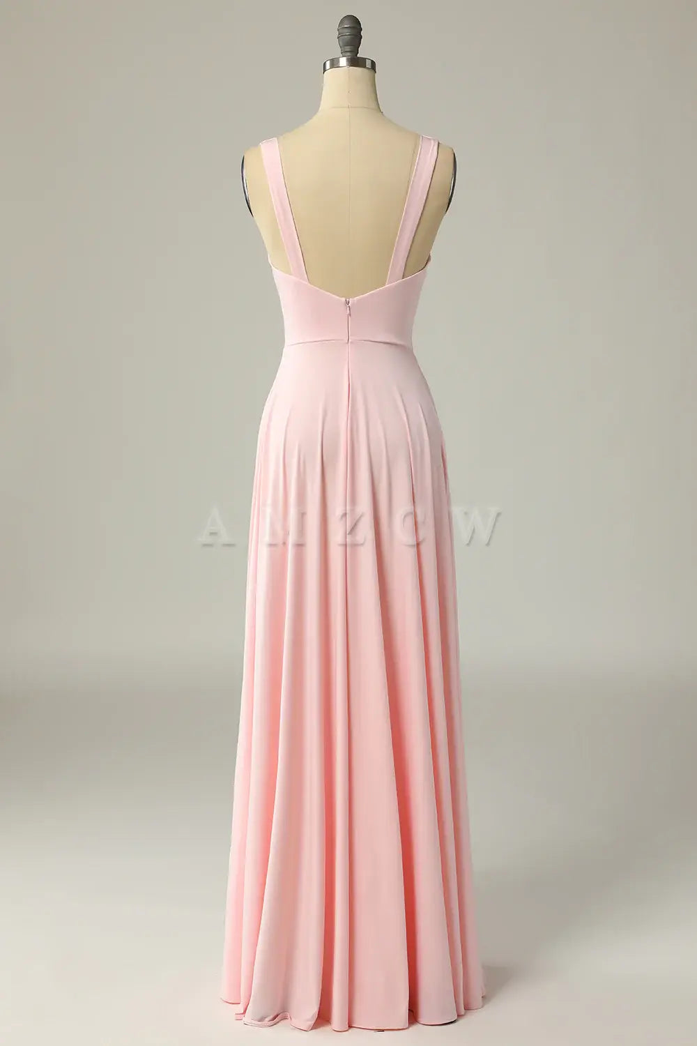 Vestido de fiesta largo rosa con escote en V, corte A clásico de Amzcw, con abertura frontal, vestidos de noche, vestidos de fiesta, tiendas de vestidos