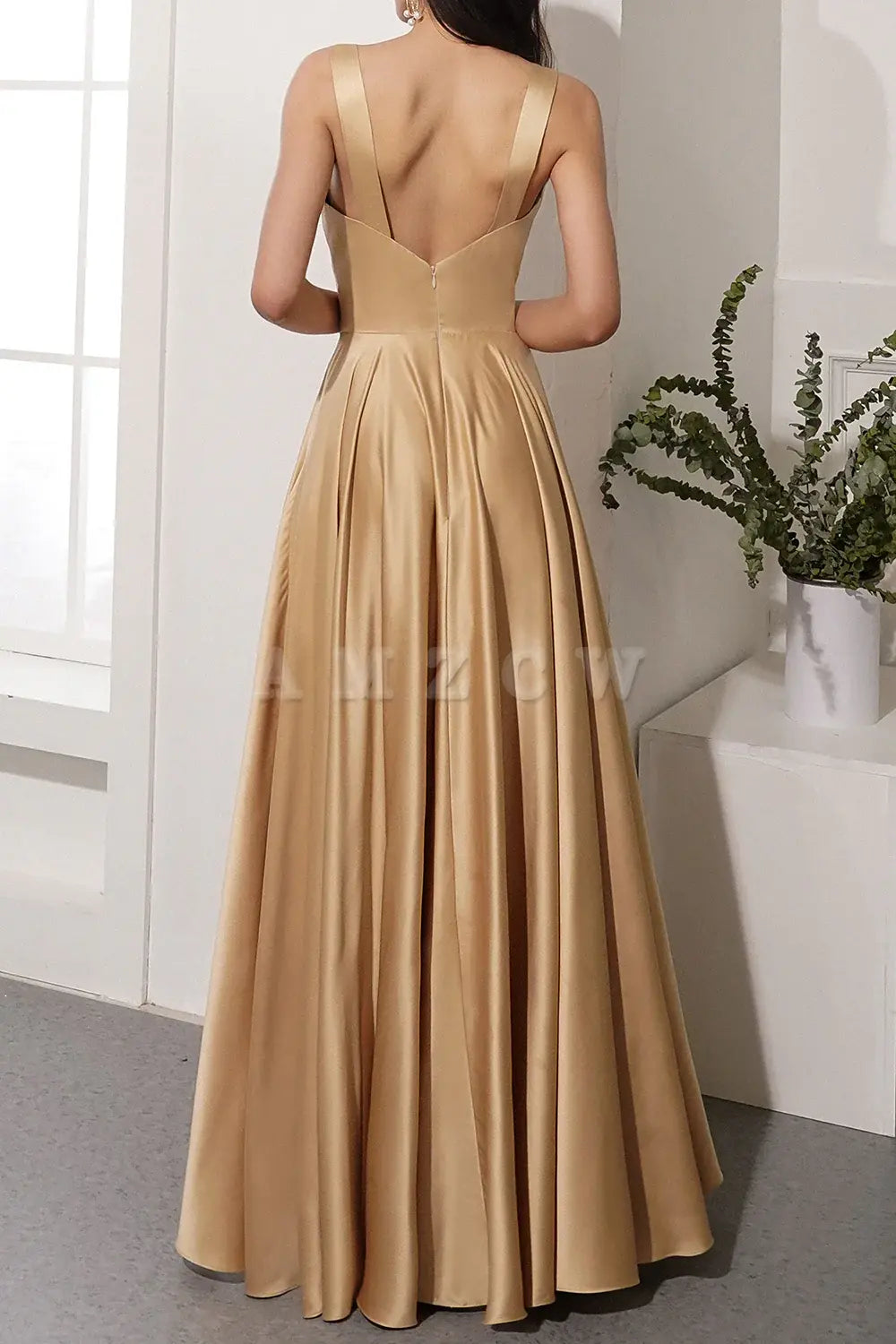 Vestido largo de fiesta de graduación con abertura en satén dorado Amzcw