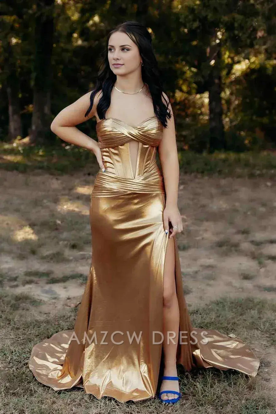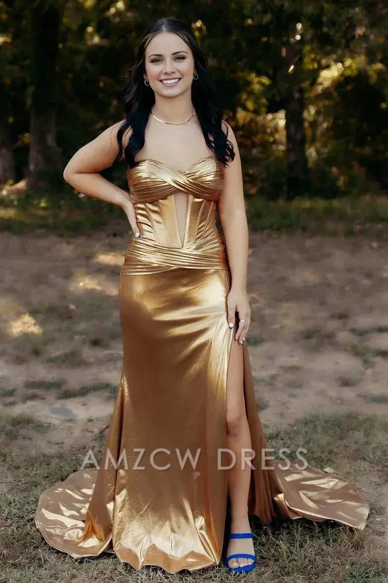 Vestido de fiesta largo Amzcw dorado sin tirantes, sirena, metalizado, sin mangas, con abertura lateral y abertura en la cerradura, vestidos formales