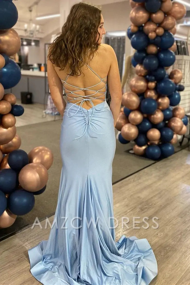 Vestido formal largo azul claro con escote en V y espalda con cordones, estilo trompeta, de Amzcw.