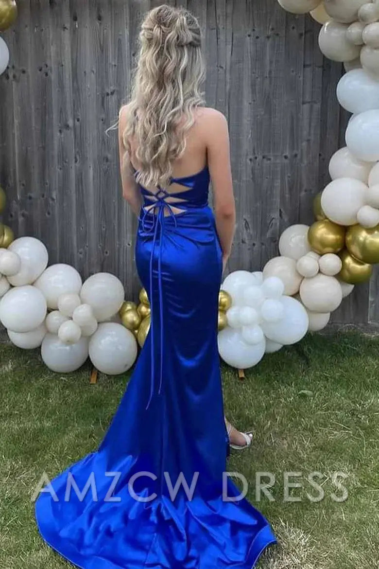 Vestido de fiesta largo de satén sin mangas con escote en V azul real sin tirantes de sirena Amzcw, vestidos formales