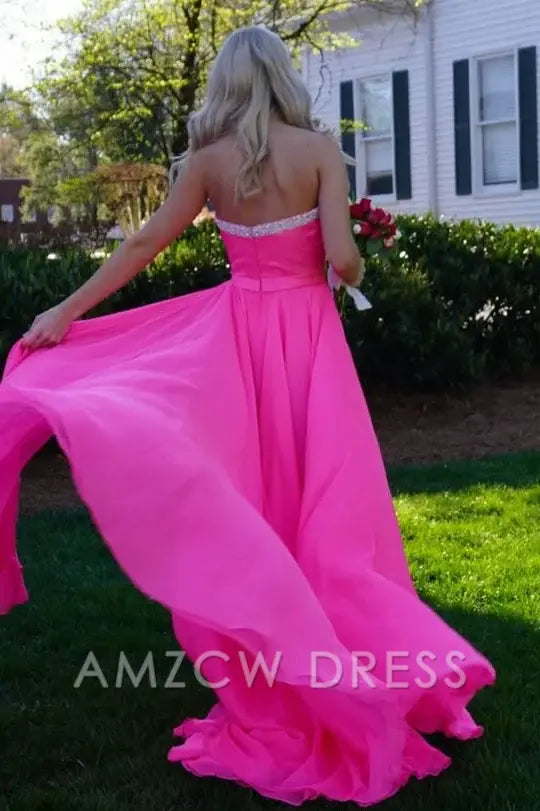 Vestido de fiesta de gasa rosa de Amzcw, sin tirantes, corte A, con cuentas, cintura imperio y abertura. Vestidos formales.